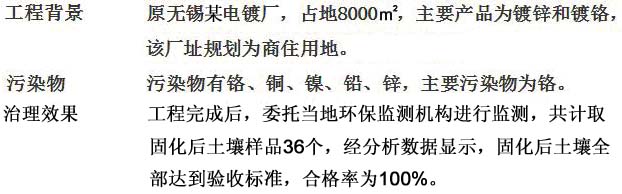 該項目場地為江蘇省無錫市的某電鍍廠原址,主要污染物為鉻及鎳、鉛、鋅等重金屬。因該項目重金屬污染樣式典型,被環保部列為2010年國家重金屬污染防治示范項目。江蘇大地益源環境修復有限公司于2011年3月至2011年9月,對該場地采取穩定化/固化和化學淋洗等技術進行了污染土壤的修復治理。