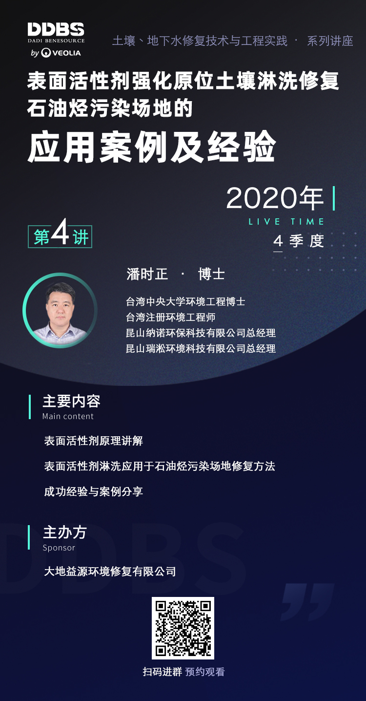 本年度DDBS系列講座的第4講,將在今年第4季度與大家見面,為大家準備的是《表面活性劑強化原位土壤淋洗修復石油烴污染場地的應用案例及經驗》主題課程。我們隆重邀請了潘時正博士主講,潘博士是臺灣中央大學環境工程博士,臺灣注冊環境工程師,專業年資近30年,曾任臺灣業興環境科技公司總經理,現任昆山納諾環保科技、瑞淞環境科技總經理。他將帶給大家表面活性劑原理及應用于石油烴污染場地修復方法的講解,以及成功經驗與案例分享,干貨十足,敬請期待!