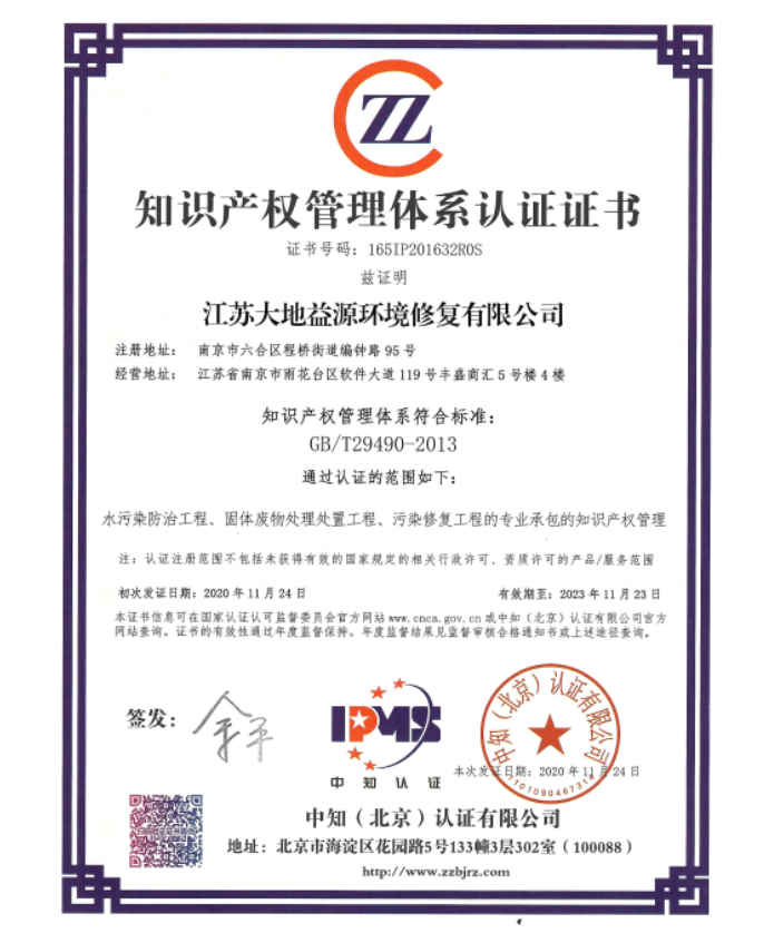 11月24日,江蘇大地益源環(huán)境修復(fù)有限公司正式獲得《知識產(chǎn)權(quán)管理體系認(rèn)證證書》,認(rèn)證范圍包括水污染防治工程、固體廢物處理處置工程、污染修復(fù)工程的專業(yè)承包的知識產(chǎn)權(quán)管理。