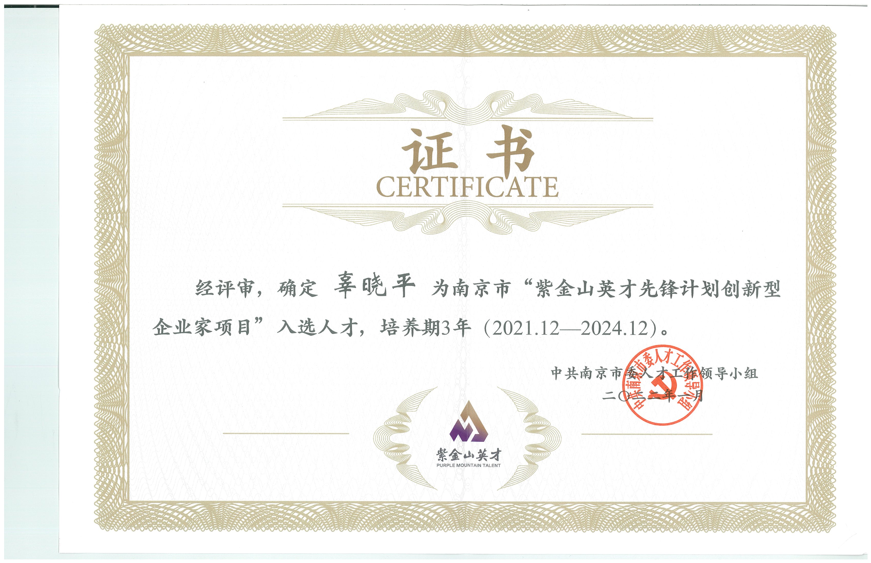 “紫金山英才計劃”,是在整合南京人才工程的基礎上,大力推進人才體制機制改革和政策創新,著力打造品牌統一、銜接有序、運作高效的人才支持體系。“紫金山英才先鋒計劃創新型企業家項目”入選名單由中共南京市委人才工作領導小組核準頒布,成功入選該計劃是對企業創新能力和經營管理能力的肯定和鼓勵。項目中創新型企業家指創辦創新型企業、具備高成長性和廣闊的市場前景、對產業發展起到引領作用的優秀企業家。