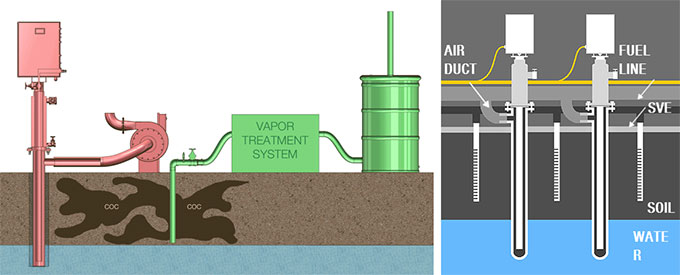 該技術以天然氣或燃油為燃料提供熱源,通過熱傳導加熱目標治理區域,同時通過動力控制,形成負壓抽提地下蒸汽。目標治理區域可以分區獨立控制,以便溫度梯度和能源的消耗量最優化。通過模塊化復制,可以無限擴展,對項目規模和場地的適應性強。